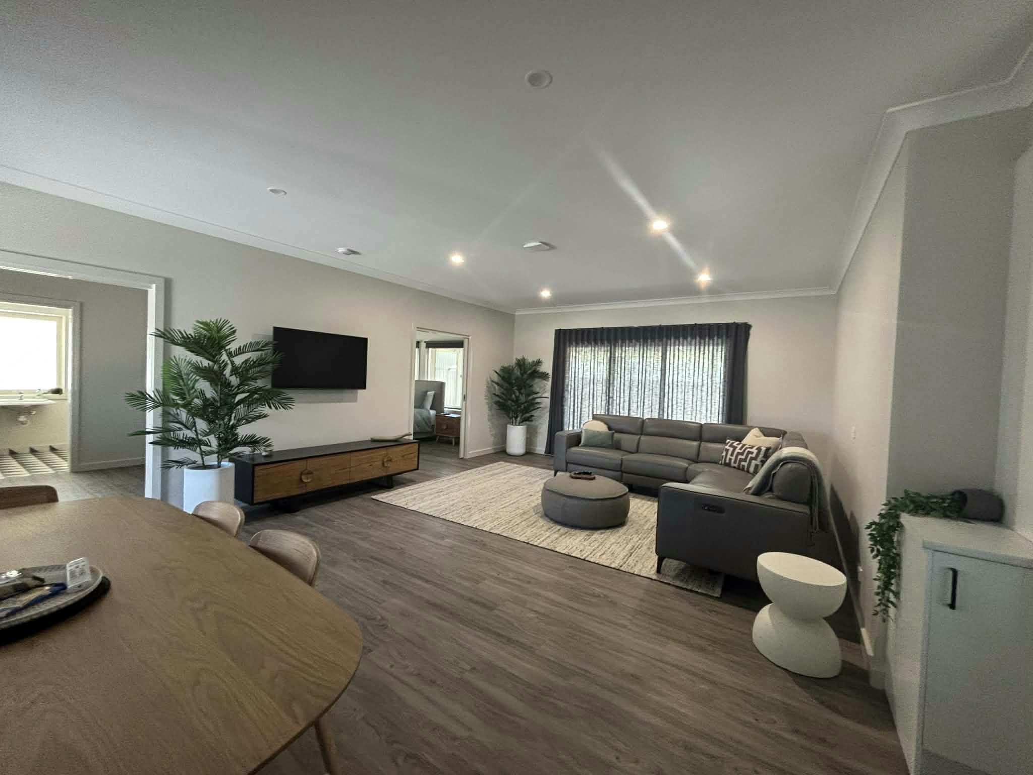Living Room: Relax in the cozy living room with a large corner lounge and TV, offering the perfect spot for movie nights or simply unwinding after a day of adventure.