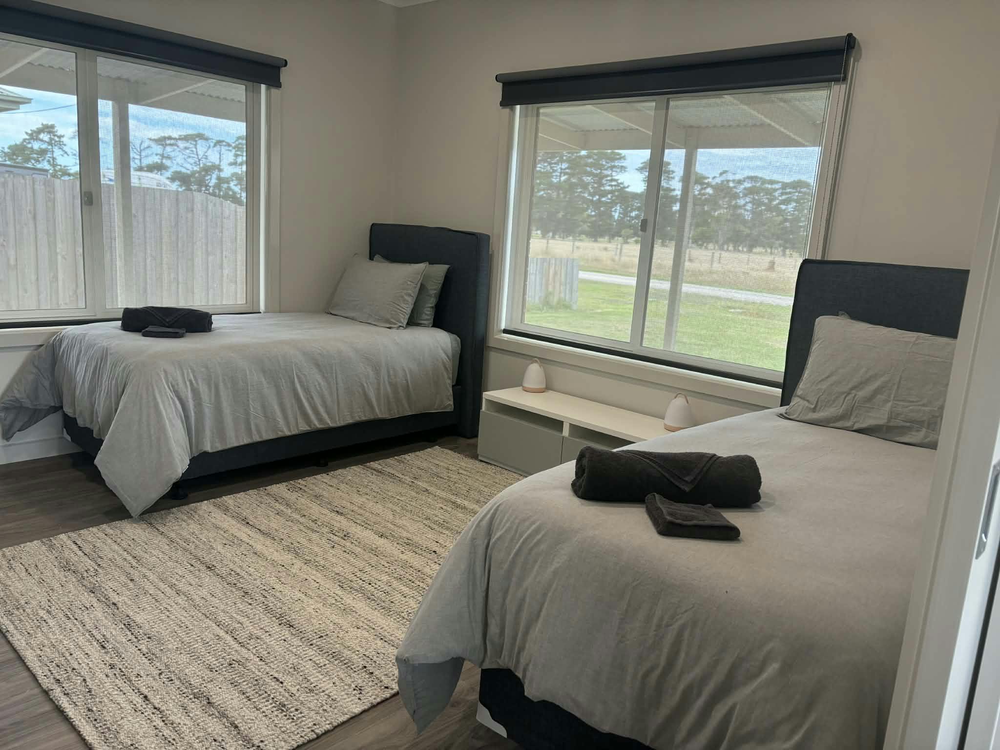 Second Bedroom: The second bedroom includes two single beds, a wardrobe for convenient storage, and its own ensuite with a large shower, making it perfect for families or friends.