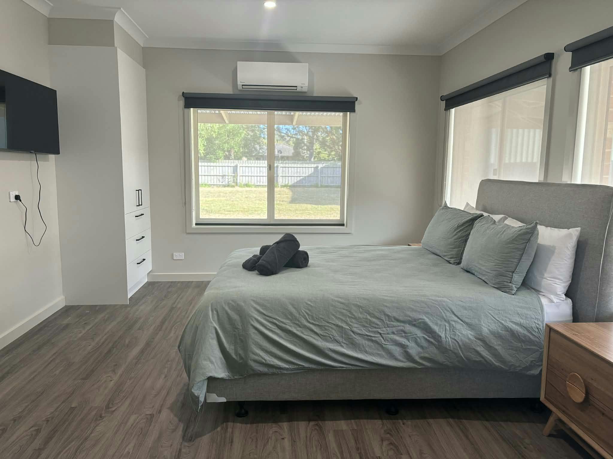 Main Bedroom: Spacious and accessible, with plenty of room for wheelchair maneuverability. The main bedroom features a comfortable queen-sized bed, TV, air-conditioner, and a wardrobe. An adjoining study with a double sofa bed provides extra sleeping space if needed.